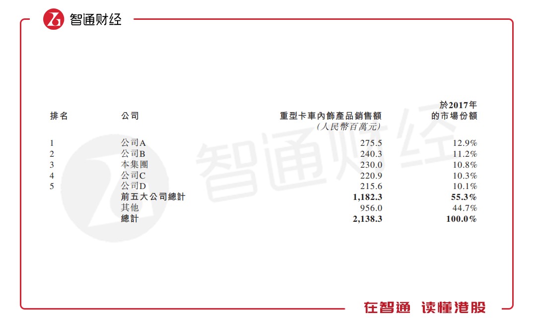 根據(jù)弗若斯特沙利文報告,按重型卡車內(nèi)飾產(chǎn)品的銷售額計,公司是中國西北最大的重型卡車內(nèi)飾產(chǎn)品制造商(2017年市場份額達62.7%)及中國的第三大制造商(2017年市場份額達10.8%);按汽車內(nèi)飾產(chǎn)品的銷售額計,公司是中國西北第二大汽車內(nèi)飾產(chǎn)品制造商(2017年市場份額達15.6%)及中國第十四大制造商(2017年市場份額達0.4%)。