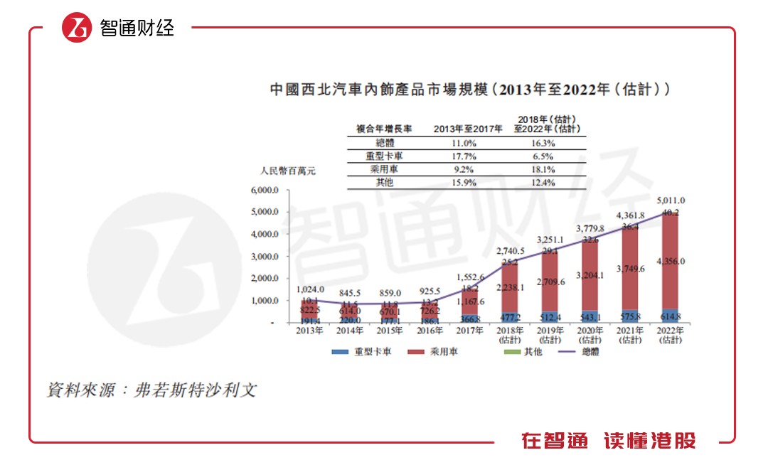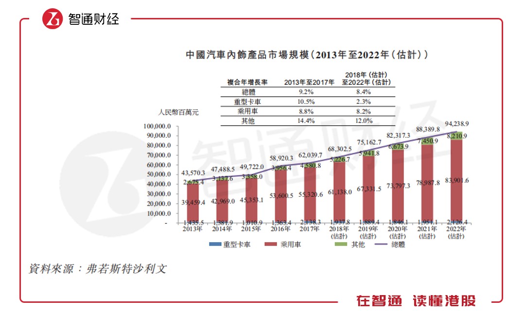 智通財經(jīng)APP進一步查閱天瑞招股說明書發(fā)現(xiàn),從行業(yè)來看中國汽車內(nèi)飾產(chǎn)品市場的總值由2013年的435.7億元增至2017年的620.4億元,復合年增長率為9.2%。估計市場規(guī)模將于2022年達到942.39億元,2018年至2022年期間的復合年增長率為8.4%。
