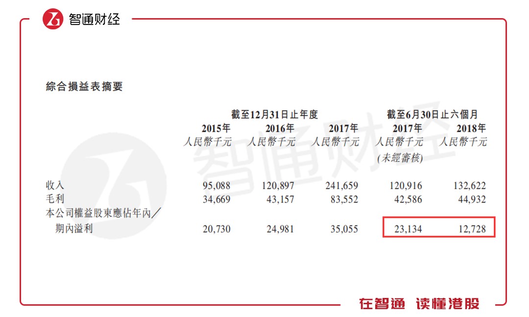 業(yè)績方面,招股書顯示,公司2015-2017年的收入分別約為9510萬元(人民幣,下同)、1.21億元及2.42億元,同期公司凈利潤分別約為2070萬元、2500萬元及3506萬元。2018年上半年,公司收入為1.33億,同比增長10%,凈利潤為1273萬,同比下降45%。凈利率由于2017年上半年的14.5%,降低至9.6%。