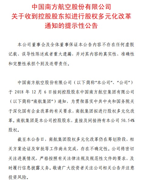 公告中稱,中國南方航空股份有限公司于2018年12月6日接到控股股東中國南方航空集團有限公司通知,為貫徹落實中共中央和國務(wù)院關(guān)于深化國有企業(yè)改革的有關(guān)要求,南航集團擬進行股權(quán)多元化改革。南航集團是本公司控股股東,直接及間接持有本公司50.54%股權(quán)。截至本公告日,南航集團股權(quán)多元化改革仍在籌劃階段,相關(guān)方案論證及審批等工作尚未完成,存在不確定性。公司將密切關(guān)注進展情況,嚴(yán)格按照有關(guān)法律法規(guī)及規(guī)范性文件的要求,及時履行信息披露義務(wù)。(文文)