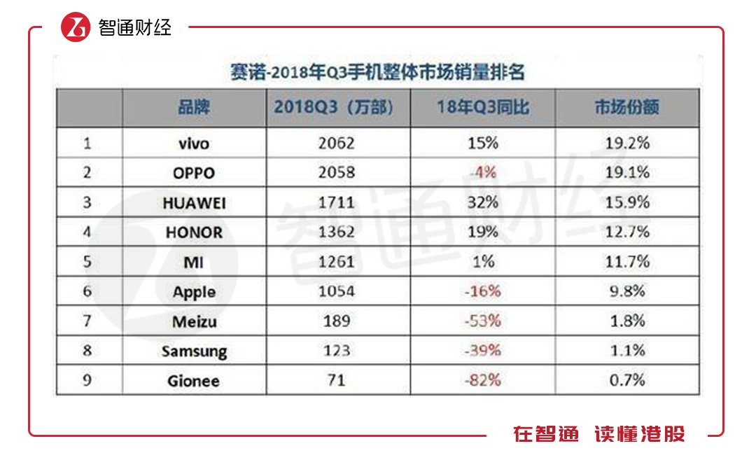 在2008年,全球前六大手機(jī)廠商,諾基亞、三星、摩托羅拉、LG、索尼愛(ài)立信和中興(00763),其中只有中興為自主品牌,但市場(chǎng)份額不足5%。再看看2018年這十年的變化,全球前六大手機(jī)廠商,三星、華為、蘋(píng)果、小米(01810)、OPPO和Vivo,其中自主品牌占了四個(gè),市場(chǎng)份額合計(jì)占比達(dá)40%。