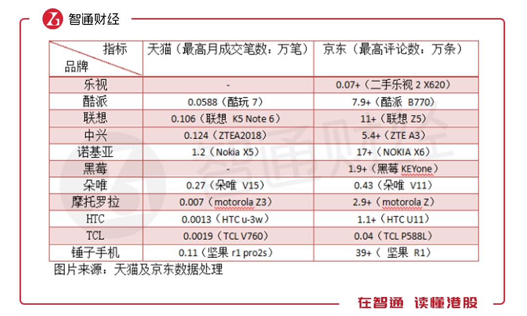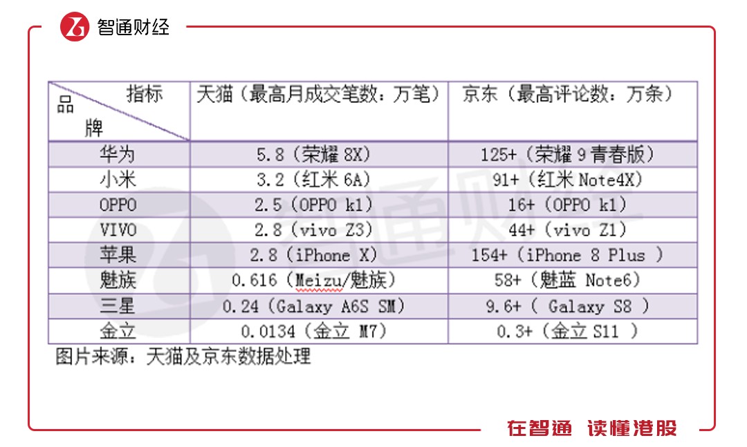 電商的崛起讓手機(jī)多了一條網(wǎng)絡(luò)強(qiáng)大的銷(xiāo)售渠道,目前天貓和京東是電商平臺(tái)中的兩大巨頭,國(guó)內(nèi)的最終商品基本在這兩大平臺(tái)售賣(mài)。智通財(cái)經(jīng)APP通過(guò)天貓及京東相對(duì)應(yīng)的月成交筆數(shù)及評(píng)論數(shù)了解不同品牌的智能手機(jī)售賣(mài)情況。