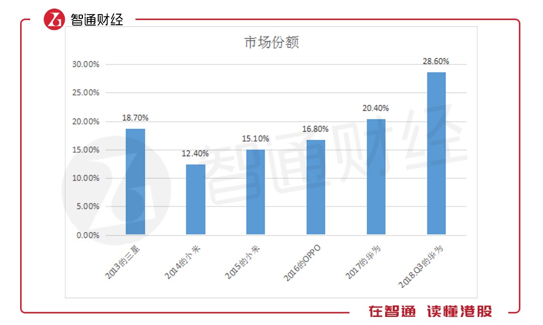 以下為從2013年市場(chǎng)中國(guó)手機(jī)市場(chǎng)最大市場(chǎng)份額變遷: