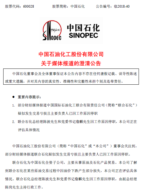 智通財經(jīng)APP獲悉,中國石化今日(12月27日)晚間在上交所發(fā)表公告稱,了解到聯(lián)合石化在某些原油交易過程中因油價下跌產(chǎn)生部分損失,公司正在評估具體情況。聯(lián)合石化總經(jīng)理陳波先生和黨委書記詹麒因工作原因停職,由副總經(jīng)理陳崗主持行政工作。此外,中國石化還表示,目前公司生產(chǎn)經(jīng)營情況一切正常。(林雅蕓)