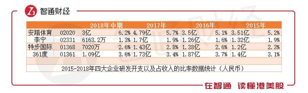 從2015-2018年中期,李寧的研發(fā)支出一直是國(guó)內(nèi)四大體育用品企業(yè)中最低的。以2018年上半年為例,李寧的研發(fā)支出為6163.2萬(wàn)元,占當(dāng)期收入的比率僅為1.3%,而安踏研發(fā)支出高至3億元,就連特步、361的研發(fā)支出比率都高于李寧。