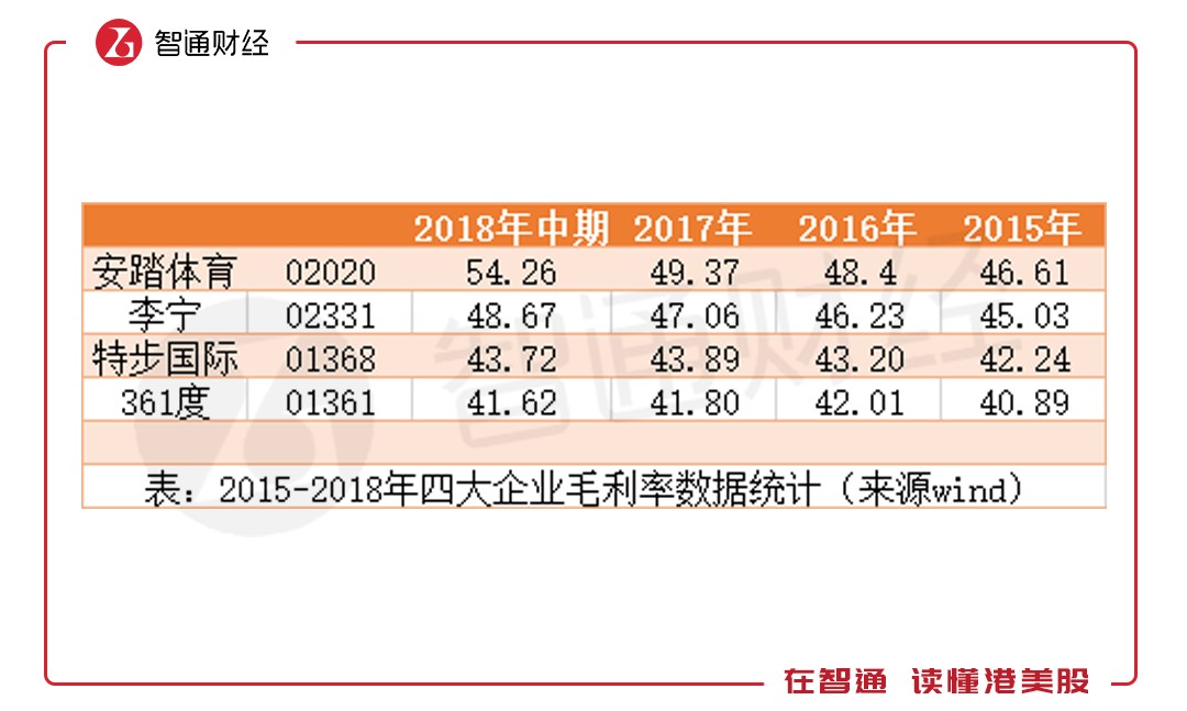 與存貨周轉(zhuǎn)率一起穩(wěn)步增長(zhǎng)的,還有毛利率,從2015年的45.03%上升至2018年上半年的48.67%。但與安踏一比,差距就出來(lái)了。2015年時(shí),雙方的毛利率差距僅1.58個(gè)百分點(diǎn)。但隨著安踏規(guī)模的擴(kuò)大,規(guī)模響應(yīng)逐漸體現(xiàn),李寧與安踏的毛利率差距加大,2018年上半年時(shí),差距擴(kuò)大至5.59個(gè)百分點(diǎn),但李寧毛利率仍高于特步和361。
