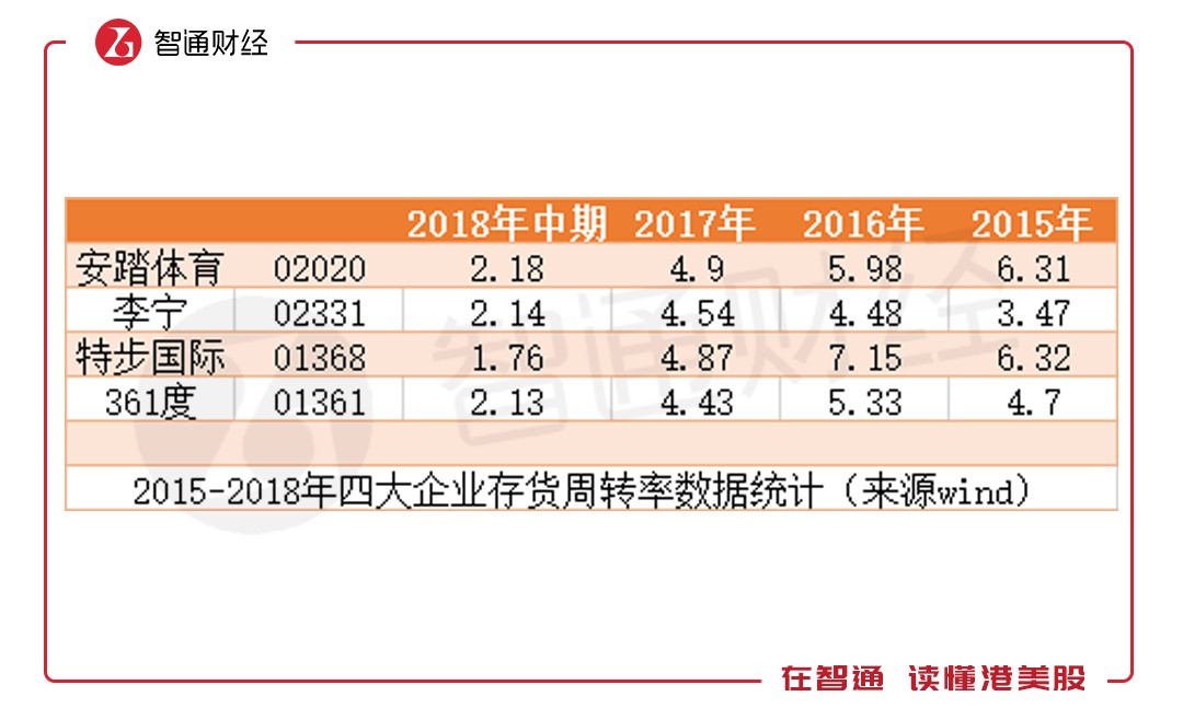 2015年時(shí),李寧雖扭虧為盈,但在存貨周轉(zhuǎn)率上,與競(jìng)爭(zhēng)對(duì)手仍相差較遠(yuǎn)。李寧當(dāng)時(shí)的存貨周轉(zhuǎn)率僅3.47次,而安踏體育(02020)為6.31次,特步國(guó)際(01368)為6.32次,連361度(01361)也有4.7次。