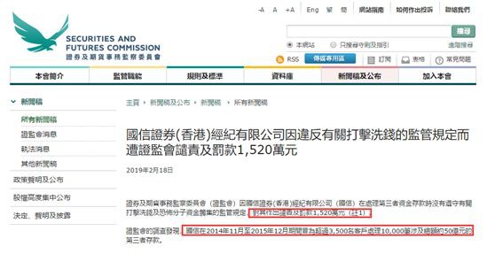 國信證券香港直至2016年3月在證監(jiān)會進(jìn)行檢視后才開始就超過2,200筆于2014年11月至2015年12月期間進(jìn)行、屬可疑交易的第三者存款,向財(cái)富情報(bào)組作出報(bào)告。
