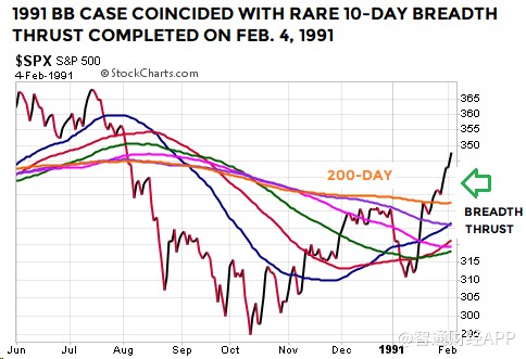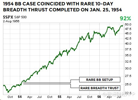 上述布林通道技術(shù)形態(tài)屬較為罕見的類型。值得注意的是,1954年和1991年時的另一技術(shù)指標,廣量沖力指標,基本上與2019年1月21日出現(xiàn)的廣量沖力指標形態(tài)類似。因此,在1954年、1991年和2019年,標普500指數(shù)走出了布林通道及廣量沖力指標都相似的技術(shù)形態(tài)。