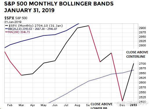 標普500指數(shù)從布林通道月線中軌以上跌至中軌以下,然后再反彈收高于中軌以上,并在此期間一直維持在下軌以上,這是標準普爾500指數(shù)相對少見的走勢,而這正是2018年至2019年發(fā)生的情況。