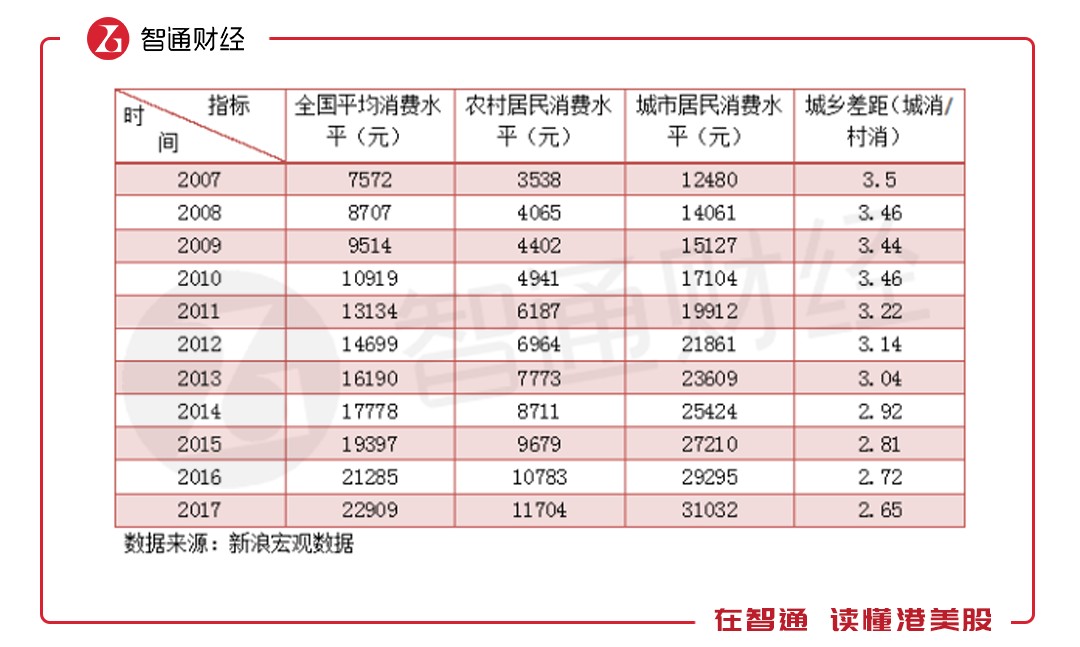 考慮到消費(fèi)能力的變化,根據(jù)新浪宏觀數(shù)據(jù),2008年農(nóng)村的消費(fèi)水平為4065元,而城市為14061元,城鄉(xiāng)差距3.46倍,不過城鄉(xiāng)差距慢慢降低了,到2017年為2.65倍,彼時(shí)農(nóng)村消費(fèi)水平為11704元,但仍偏低,相當(dāng)于城市2007年的水平。