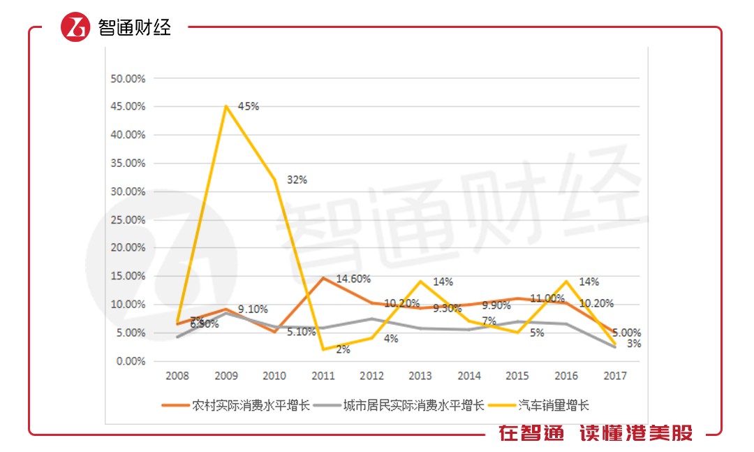 從圖表上看,消費(fèi)水平的變化跟汽車銷量增長關(guān)系度并不是很強(qiáng),特別是農(nóng)村地區(qū),比如2011年農(nóng)村消費(fèi)水平增長達(dá)14.6%,同比增加9.5個(gè)百分點(diǎn),而汽車銷量卻僅增長2%,同比下滑了30個(gè)百分點(diǎn)。但2017年這三者達(dá)成了共識,增長水平均下滑,2018年預(yù)計(jì)仍同向變動。