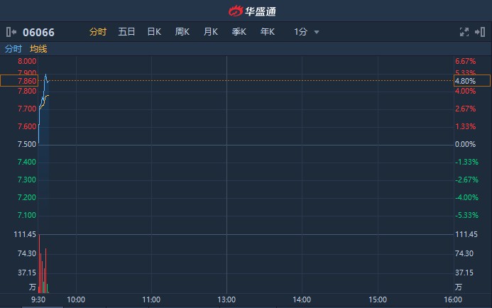 中信建投(06066)A股早盤打開漲停后又快速封板,H股跟隨上漲,截至9時37分,漲4.8%,報7.86港元,成交額額達3681萬港元。