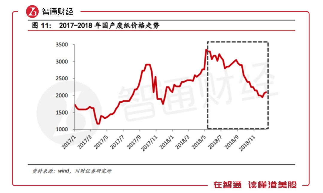 而在2018年,進(jìn)口廢紙配額大幅減少及質(zhì)量要求的收緊,導(dǎo)致了進(jìn)口及國(guó)內(nèi)廢紙的供應(yīng)及價(jià)格均出現(xiàn)急劇波動(dòng)。因此售價(jià)在業(yè)績(jī)期間內(nèi)出現(xiàn)普遍下跌,造成盈利能力的下跌。且據(jù)券商預(yù)計(jì),2019年外廢進(jìn)口政策將繼續(xù)收緊,到2020年將全面禁止外廢進(jìn)口,這將進(jìn)一步對(duì)紙業(yè)原材料價(jià)格產(chǎn)生影響。