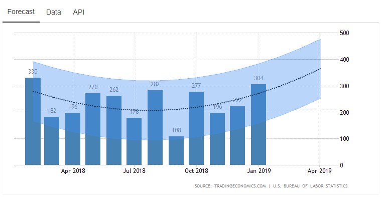 根據(jù)Trading Economics的預測,2月非農數(shù)據(jù)將會延續(xù)1月的勢頭,呈現(xiàn)上行趨勢。