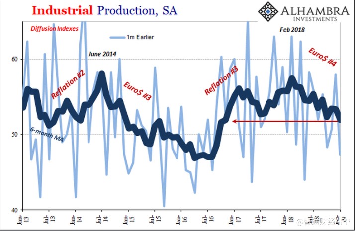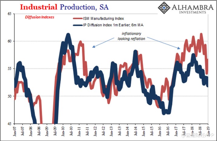 美聯(lián)儲(chǔ)計(jì)算了一個(gè)擴(kuò)散指數(shù)(滯后一個(gè)月,即更新后的擴(kuò)散指數(shù)為2019年1月)作為其工業(yè)生產(chǎn)數(shù)據(jù)的一部分。月度數(shù)據(jù)表現(xiàn)不穩(wěn)定,但平均而言在時(shí)間和解讀上是明確無誤的。即使是ISM制造業(yè)的PMI的走勢(shì)也幾乎跟隨美聯(lián)儲(chǔ)擴(kuò)散指數(shù)。