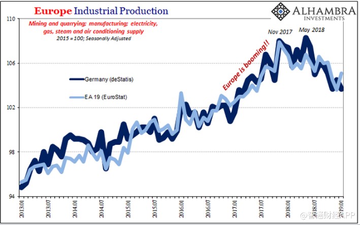歐盟統(tǒng)計(jì)局對(duì)整個(gè)歐洲工業(yè)生產(chǎn)的估計(jì),包括從德國收集的工業(yè)生產(chǎn)和重新利用的工業(yè)生產(chǎn)數(shù)據(jù)顯示,歐洲的產(chǎn)量在過去三個(gè)月中(11月、12月、1月)同比增速均出現(xiàn)下降,觸及2012 -13年經(jīng)濟(jì)衰退以來低點(diǎn)。