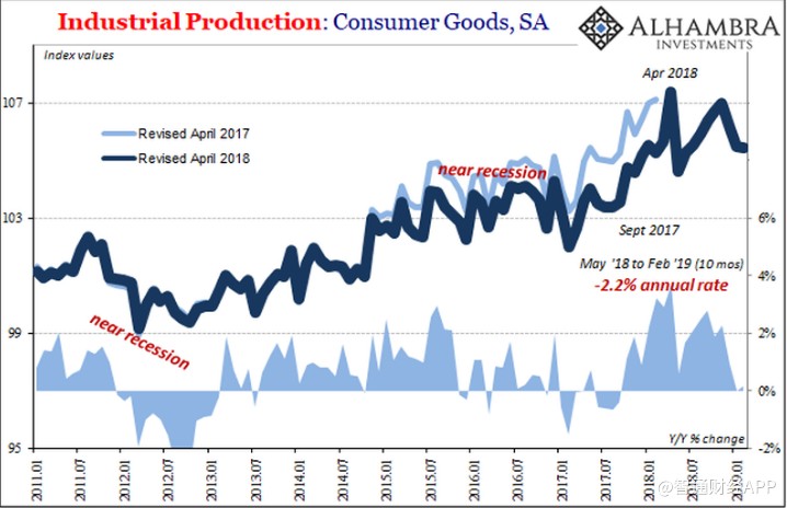 美國制造業(yè),特別是消費(fèi)品行業(yè),與歐洲(以及中國)行業(yè)發(fā)展形勢(shì)趨同。追溯到去年五月,美國商品行業(yè)幾乎沒有增長。就消費(fèi)品而言(更接近經(jīng)濟(jì)放緩的權(quán)重),它與歐洲出現(xiàn)的完全萎縮狀況非常相似。