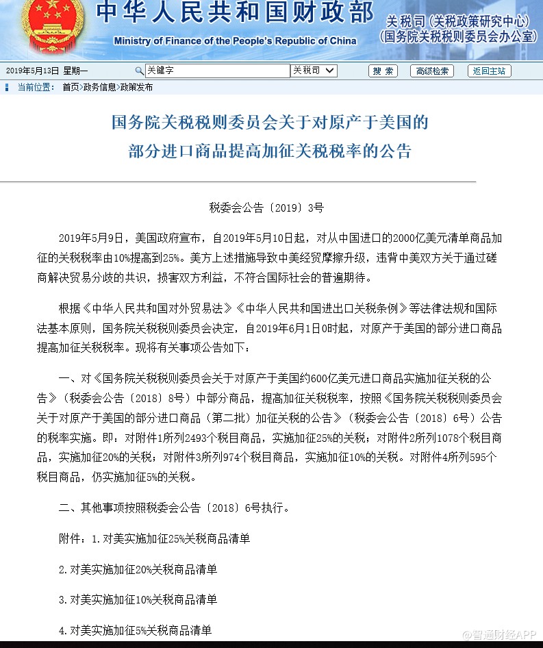 智通財(cái)經(jīng)APP獲悉,據(jù)財(cái)政部官網(wǎng)消息,2019年5月9日,美國(guó)政府宣布,自2019年5月10日起,對(duì)從中國(guó)進(jìn)口的2000億美元清單商品加征的關(guān)稅稅率由10%提高到25%。美方上述措施導(dǎo)致中美經(jīng)貿(mào)摩擦升級(jí),違背中美雙方關(guān)于通過(guò)磋商解決貿(mào)易分歧的共識(shí),損害雙方利益,不符合國(guó)際社會(huì)的普遍期待。