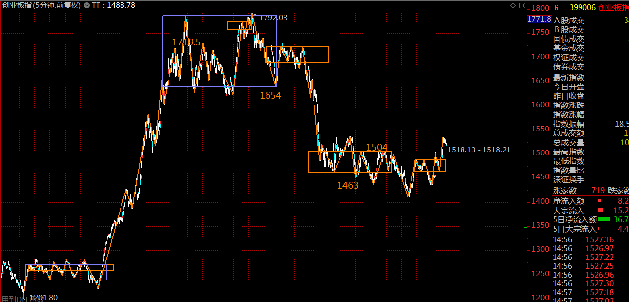 創(chuàng)業(yè)板空間可能相對較大,壓力位在1654點附近,這里同樣是處在五分鐘上漲趨勢中,耐心持股待漲,直至出現(xiàn)五分鐘趨勢背馳為止。