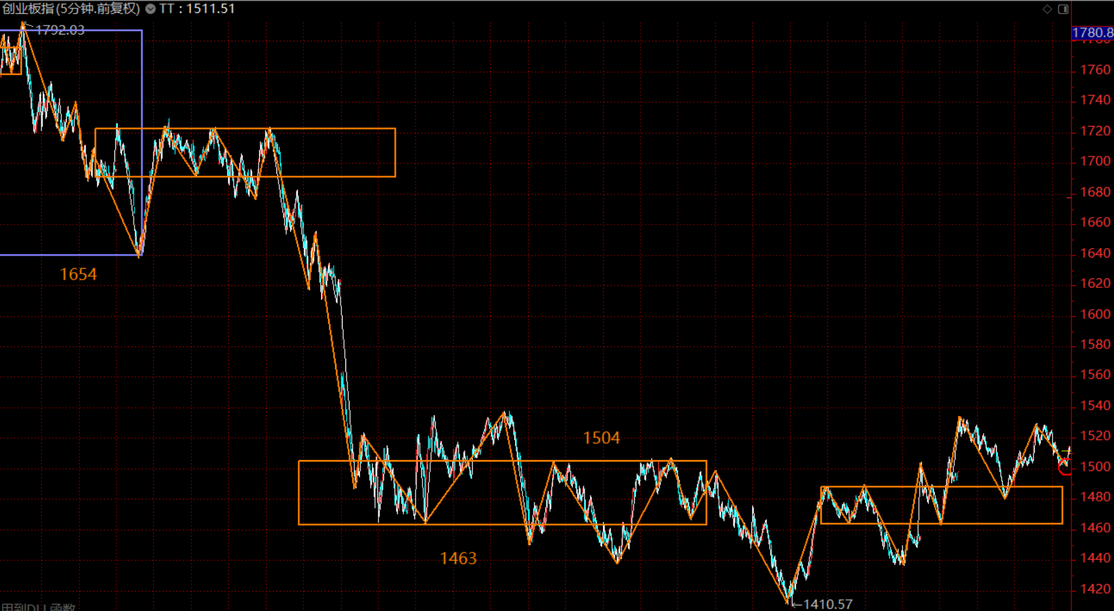 創(chuàng)業(yè)板這里未拉離最后一個(gè)30分鐘中樞(1463-1504),在中樞上軌附近橫盤,這里做同級(jí)別分解后,紅圈圈位置為五分鐘級(jí)別的第三類買點(diǎn)。因此,綜合兩個(gè)股指,周初市場(chǎng)上漲,后半段需轉(zhuǎn)入防守,逐步縮減倉(cāng)位,以應(yīng)對(duì)回調(diào)。