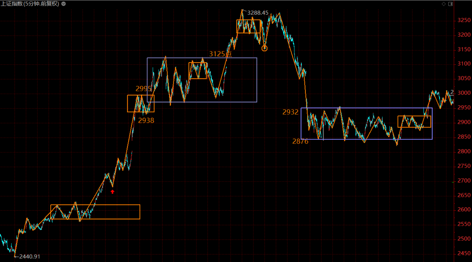 下圖為上證指數(shù)五分鐘級(jí)別走勢(shì)結(jié)構(gòu)。從走勢(shì)結(jié)構(gòu)上看,這里走出標(biāo)準(zhǔn)30分鐘級(jí)別第三類買點(diǎn),本周有望往上繼續(xù)拓展,甚至回補(bǔ)3050點(diǎn)缺口。同時(shí),我們也關(guān)注到,這個(gè)位置形成了5分鐘上漲段的第二個(gè)中樞,本周的上漲很有可能會(huì)形成趨勢(shì)背馳。因此,本周的大方向應(yīng)該為持股待漲,越長(zhǎng)越賣。在滬指回補(bǔ)缺口過程中,完成降倉(cāng)。