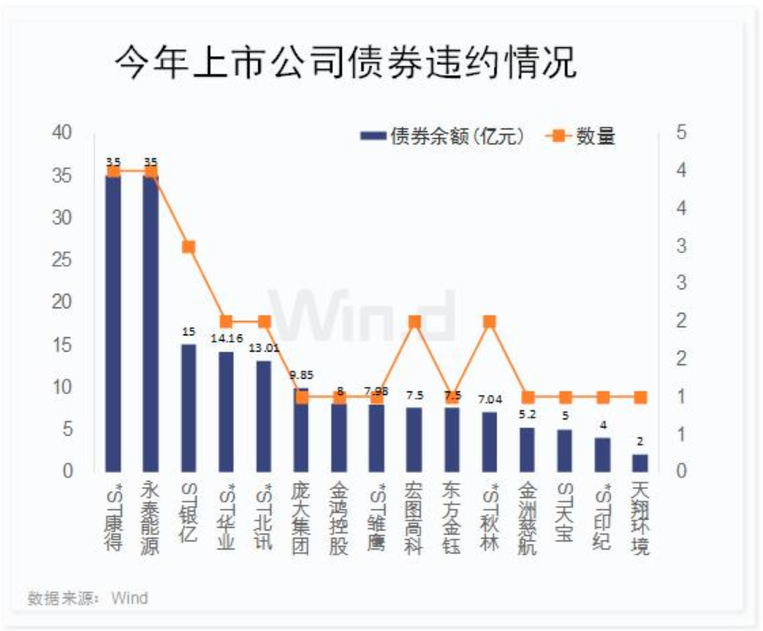 Wind數(shù)據(jù)顯示,今年以來,兩市共有15家A股上市公司累計27只債券違約,涉及債券余額總計176.24億元。