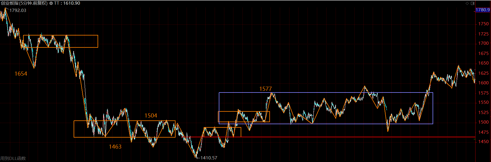 創(chuàng)業(yè)板指數(shù)依舊強勢,這里在構(gòu)建30分鐘級別的三買,以1577點為界,如果回調(diào)不破,則這里將是創(chuàng)業(yè)板主升行情的起點。如若重新跌回中樞內(nèi)部,則按中樞震蕩處理。創(chuàng)業(yè)板走勢要強于主板很多,后續(xù)行情多半仍然圍繞創(chuàng)業(yè)板展開。