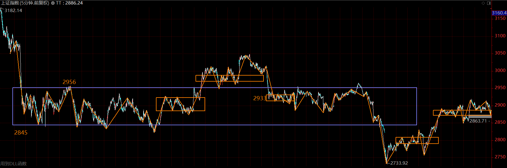 上證指數(shù)上周在這個位置做中樞擴展,將五分鐘上漲的第二個中樞擴展為三十分鐘級別的。這是強勢的一種表現(xiàn),市場在震蕩中消化拋壓。這里需關(guān)注大中樞的下軌2845點,跌破后,可能會帶來指數(shù)的二次探底,這將是絕佳的加倉點位,不跌破則市場隨時會上攻2950點。目前態(tài)勢下,應(yīng)以持倉為主。