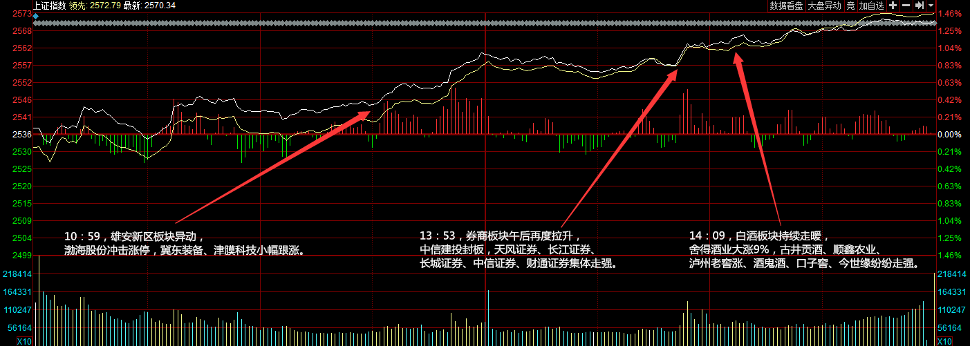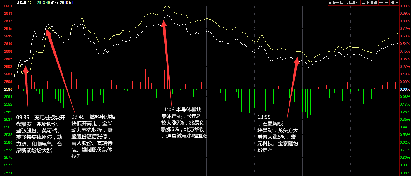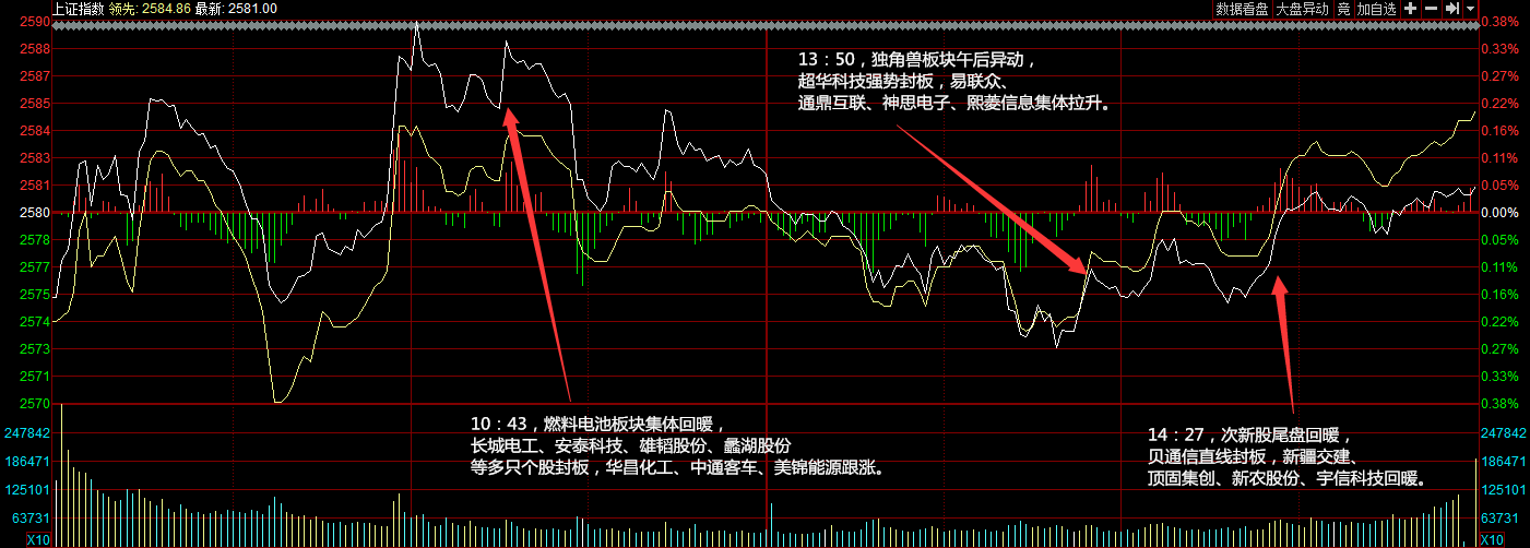 兩市今日平開,隨后氫燃料電池、券商板塊攻勢再起推動指數(shù)沖高,早盤兩市震蕩走強。午后指數(shù)持續(xù)拉升,大消費板塊崛起,白酒板塊受資金追捧領漲市場,市場人氣比較活躍。