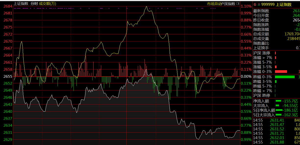 截至早盤(pán)收盤(pán),上證指數(shù)報(bào)2637點(diǎn),跌1.05%;深證成指報(bào)7705點(diǎn),跌1.70%;創(chuàng)業(yè)板指數(shù)報(bào)1328點(diǎn),跌1.48%。