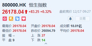 恒生指數(shù)開(kāi)盤(pán)漲0.32%,報(bào)26178.04點(diǎn)。國(guó)企指數(shù)漲0.28%,報(bào)10388.22點(diǎn)。紅籌指數(shù)漲0.12%,報(bào)4319.29點(diǎn)。大市盤(pán)前成交18.01億港元。