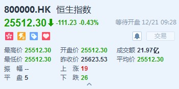 恒生指數(shù)開(kāi)盤(pán)跌238.02點(diǎn)或0.92%,報(bào)25515.4點(diǎn)。國(guó)企指數(shù)跌1.1%,報(bào)9990.09點(diǎn)。紅籌指數(shù)跌0.91%,報(bào)4086.09點(diǎn)。大市盤(pán)前成交26.82億港元。