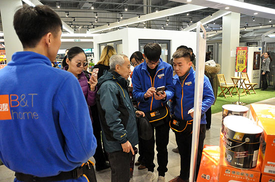 3月3日上午,百安居北京金四季店的工作人員幫顧客注冊(cè)會(huì)員。
