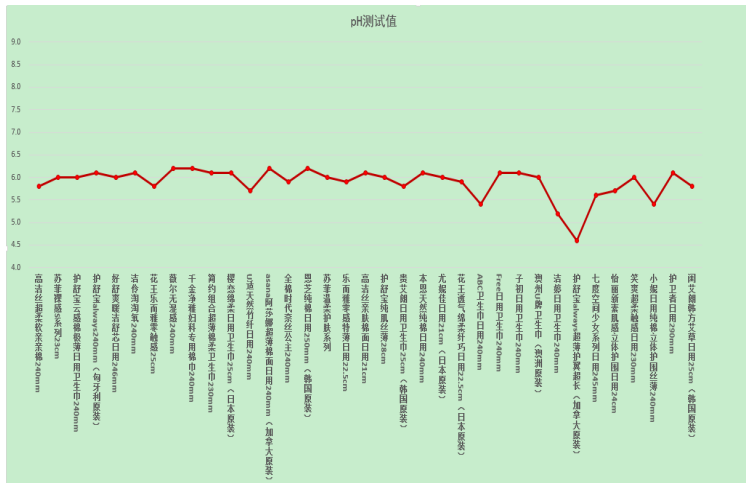 女性特殊時(shí)期的抗病能力大大降低,而與皮膚密切接觸的衛(wèi)生巾的酸堿度即pH值是關(guān)乎女性特殊時(shí)期健康的重要因素。據(jù)婦幼保健醫(yī)生介紹,衛(wèi)生巾的pH值在弱酸性至堿性對(duì)人體最安全。本次比較試驗(yàn)35款衛(wèi)生巾pH值測(cè)試結(jié)果均在4.5到6.5之間,對(duì)人體無(wú)害。pH值測(cè)試結(jié)果見(jiàn)下圖。