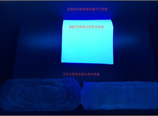 下圖為含有熒光增白物質(zhì)的紙張與衛(wèi)生巾樣品測(cè)試對(duì)比圖