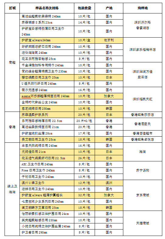 據(jù)前期調(diào)研發(fā)現(xiàn),國(guó)外品牌衛(wèi)生巾更受女性消費(fèi)者青睞,很多消費(fèi)者認(rèn)為國(guó)外品牌衛(wèi)生巾質(zhì)量更優(yōu)更值得信賴(lài),進(jìn)而選擇跨境或海淘等方式購(gòu)買(mǎi)國(guó)外產(chǎn)品。因此,本次樣品分別從深圳商超、香港、線上海淘購(gòu)買(mǎi)樣品進(jìn)行測(cè)試和比較,樣品涉及11款國(guó)外原裝產(chǎn)品。詳見(jiàn)下表。