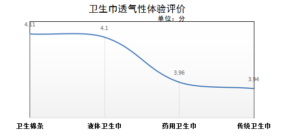 在本次主觀體驗透氣性方面,衛(wèi)生棉條評價最高,平均得分4.11分;其次是液體材料衛(wèi)生巾,平均得分4.1分;藥用衛(wèi)生巾和傳統(tǒng)型衛(wèi)生巾透氣性評價稍遜,平均得分分別為3.96和3.94分。