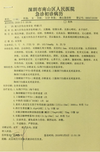 第二天,張女士立刻去深圳市南山區(qū)人民醫(yī)院急診科就診,初步診斷為“全身多處挫傷”。羅小姐說,“當(dāng)時(shí)的法醫(yī)鑒定結(jié)果是輕微傷,法醫(yī)鑒定貼好封條交給了派出所。”