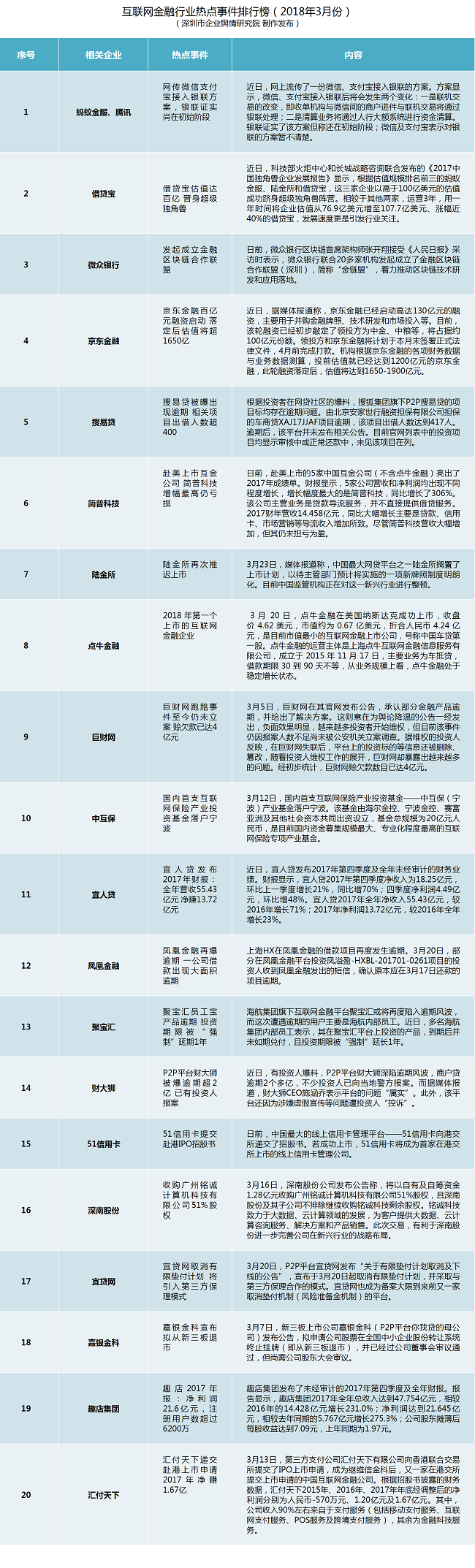 互聯(lián)網(wǎng)金融行業(yè)熱點事件排行榜榜單說明:本榜單主要通過計算機系統(tǒng)對輿情數(shù)據(jù)的自動采集、整理和分析,結(jié)合輿情分析師的篩選和研判,對2018年3月1日至3月31日這一時段內(nèi)互聯(lián)網(wǎng)金融領(lǐng)域的熱點輿情事件(主要是涉企輿情)作出綜合評估而得。主要評估指標(biāo)包含新聞報道指數(shù)、微博擴(kuò)散指數(shù)、論壇參與指數(shù)和境外炒作指數(shù),在上述指標(biāo)基礎(chǔ)上,根據(jù)相關(guān)算法得出事件綜合影響力指數(shù),按照指數(shù)大小進(jìn)行排序。