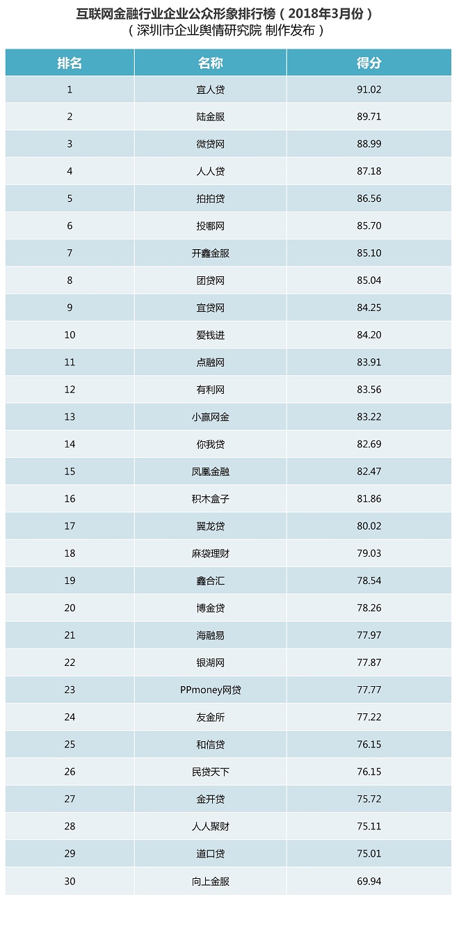 互聯(lián)網(wǎng)金融行業(yè)企業(yè)公眾形象排行榜:本榜單根據(jù)公開可查的信息、數(shù)據(jù),從規(guī)模實力、合規(guī)性、交易金額、信披透明度、輿論曝光度和負(fù)面影響等六個維度,對2018年3月1日至3月31日這一時段內(nèi)互聯(lián)網(wǎng)金融行業(yè)各企業(yè)的公眾形象進(jìn)行綜合評估并排名,旨在對互聯(lián)網(wǎng)金融行業(yè)各企業(yè)開展品牌形象塑造、宣傳推廣策略、公共關(guān)系維護(hù)、品牌影響力等方面的綜合評價,既幫助相關(guān)企業(yè)找準(zhǔn)合適的品牌定位、發(fā)展方向,也為消費者和投資者提供科學(xué)、公正、獨立的消費和投資決策參考。