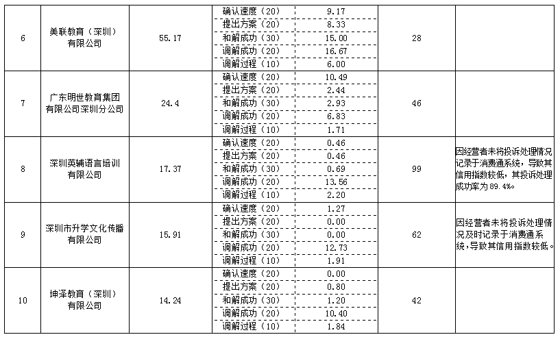 深圳英輔語言培訓(xùn)有限公司和深圳市升學(xué)文化傳播有限公司因經(jīng)營者未將投訴處理情況記錄于消費(fèi)通系統(tǒng),導(dǎo)致兩家企業(yè)信用指數(shù)較低。其中深圳英輔語言培訓(xùn)有限公司投訴處理成功率為89.4%,因未記錄于消費(fèi)通系統(tǒng),極大地影響其信用指數(shù)和排名。深圳市消委會(huì)在此提醒各行業(yè)企業(yè),重視消費(fèi)者權(quán)益保護(hù)工作,及時(shí)處理消費(fèi)者投訴、與消費(fèi)者提早和解,嚴(yán)格按照消費(fèi)通系統(tǒng)要求記錄投訴處理情況,體現(xiàn)消費(fèi)維權(quán)信用對(duì)消費(fèi)者的消費(fèi)指導(dǎo)作用。