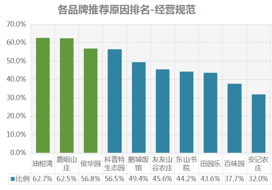 排名第一的是油柑灣,經(jīng)營(yíng)規(guī)范推薦率為62.7%;其次是鹿咀山莊,推薦率為62.5%;第三名是俊華園,推薦率為56.8%。