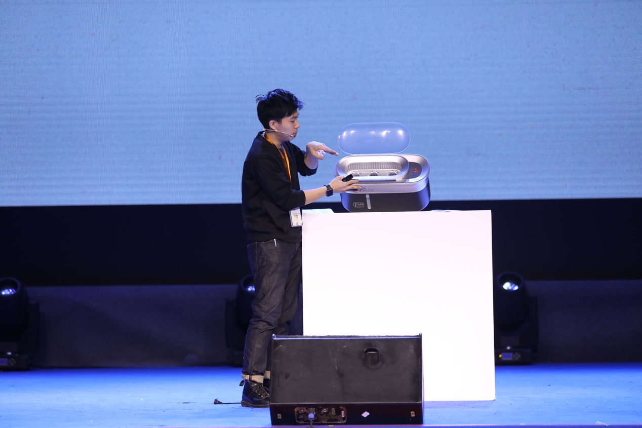 10件作品的設計師全部完成作品答辯后,7位評委進入評審室進行統(tǒng)計結果復議。在此期間,首屆金箍棒國際設計大獎賽金獎得主賈鵬,以及金箍棒工業(yè)產(chǎn)品設計江陰有限公司運營總監(jiān)何田鑫分別上臺,為現(xiàn)場觀眾帶來產(chǎn)品設計和創(chuàng)業(yè)理念方面的分享,獲得了現(xiàn)場的陣陣掌聲。