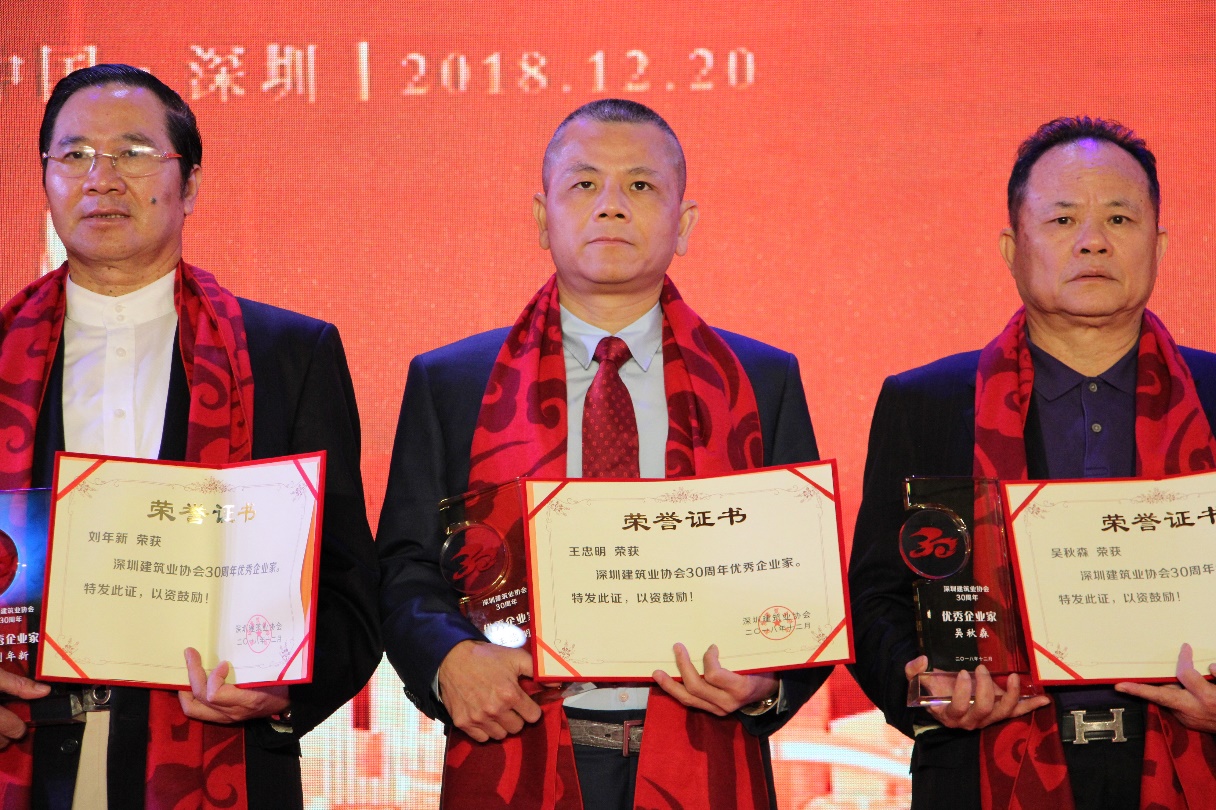 本次慶典上,深圳建筑業(yè)協(xié)會表彰了一批在促進、推動深圳建筑行業(yè)發(fā)展中作出重大貢獻的優(yōu)秀企業(yè)和個人,鼓勵他們不斷探索創(chuàng)新,共同創(chuàng)造深圳建筑業(yè)的輝煌。深圳市建被授予“30周年優(yōu)秀施工企業(yè)”;翠林投資集團董事長王忠明榮獲深圳建筑業(yè)協(xié)會“30周年優(yōu)秀企業(yè)家”稱號;深圳市建員工盧燦光、郝崇民榮獲“30周年優(yōu)秀項目經理”稱號;深圳市建老員工李炳坤榮膺“30周年優(yōu)秀工匠”稱號。