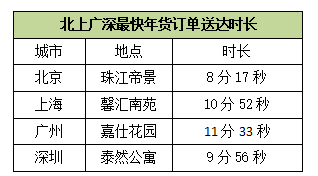 11.平均不出50分鐘,消費(fèi)者就能收到最新鮮的年貨,年貨訂單最快8分17秒送到家。