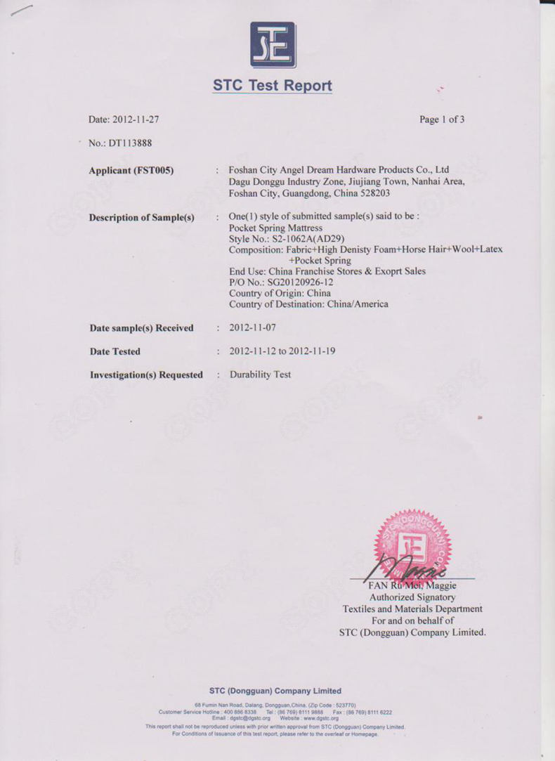 雙重熱處理起到一個全面消除了彈簧的內應力,增加抗疲勞強度,提高了彈性極限,使彈簧的彈性、拉力和回彈力更好,床芯不易凹塌變形,彈簧不易折斷。經權威檢測機構STC測試證明:嚴格按照美標ASTM1566耐疲勞測試,西婭圖品牌床墊達到10萬次連續(xù)錘壓不變形。(吳艷 通訊員/阿東)