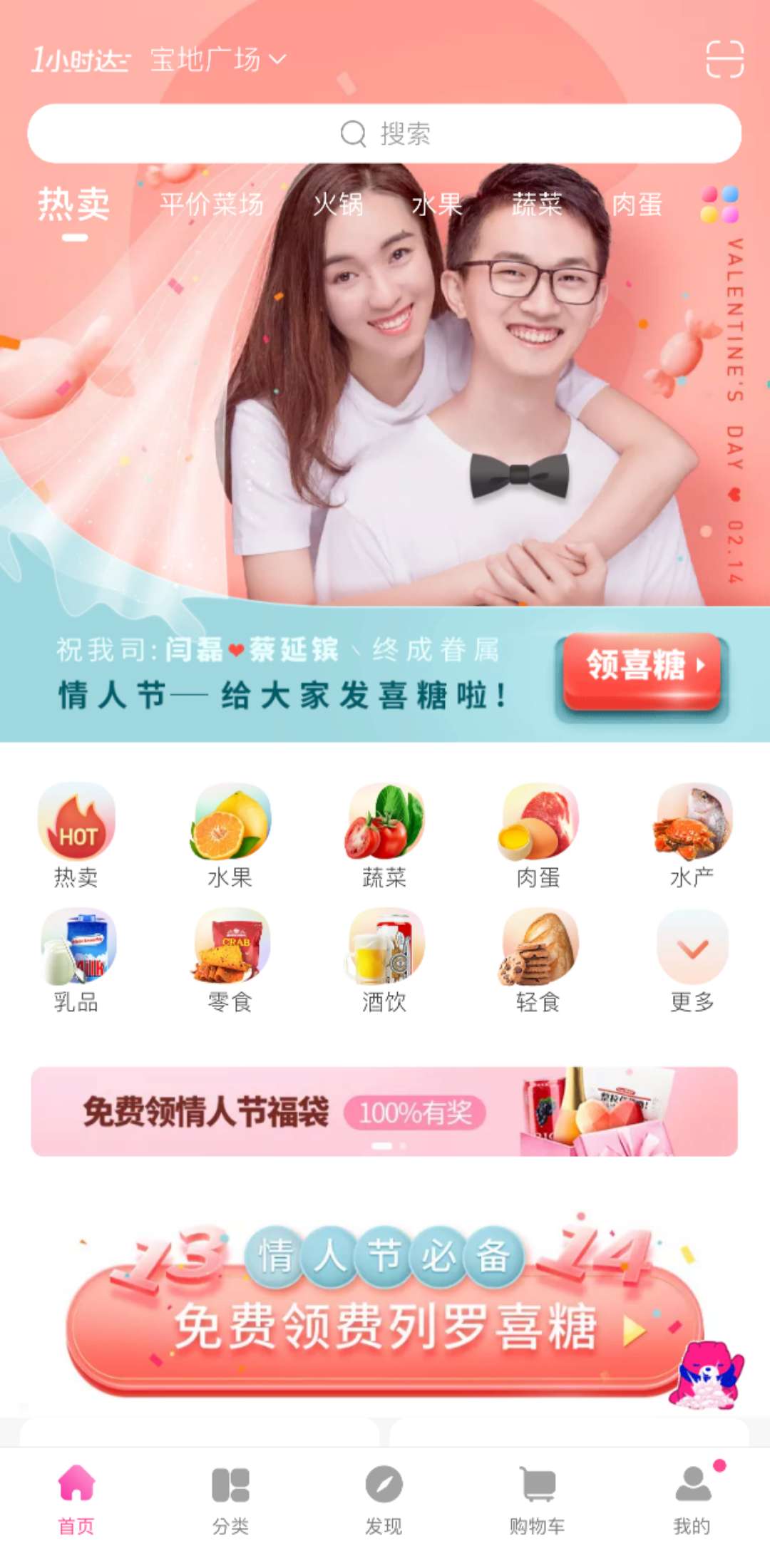 2月13-14日,廣州、深圳地區(qū)每日優(yōu)鮮用戶登錄每日優(yōu)鮮APP首頁,便看到兩位新人的甜蜜的結婚照,讓大家非常意外。