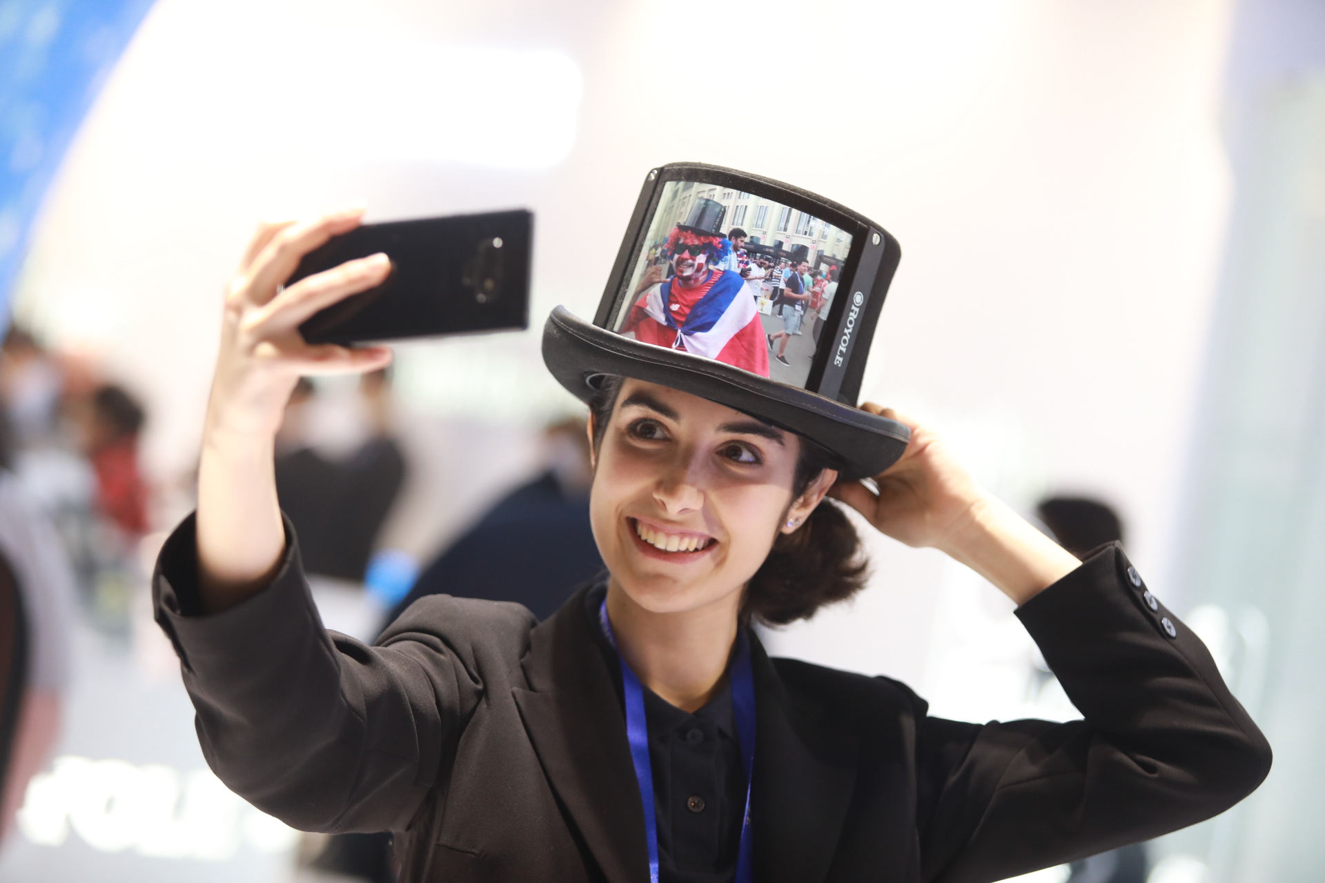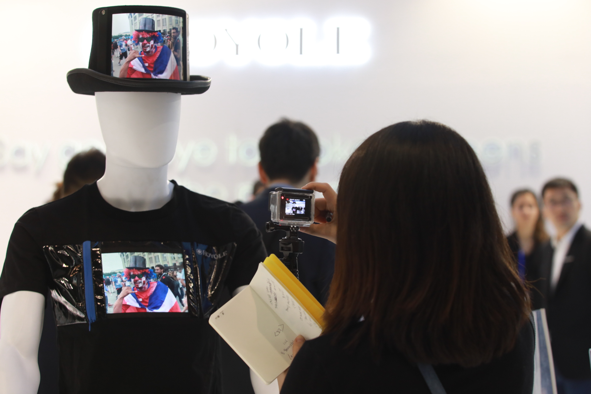 法國一女士體驗高清柔性屏時尚衣帽后對柔宇工作人員說:"柔性屏時尚衣帽套裝超酷,這個如果能穿去派對的話就太完美了。"