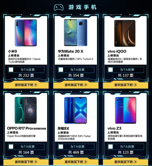 而游戲手機候選產(chǎn)品則包括:小米9、華為Mate20 X、vivo iQOO、OPPO R17 Pro王者榮耀定制版、榮耀8X、vivo Z3六強爭霸,同樣截至3月12日,第一天的投票中,榮耀8X脫穎而出,暫時領先。